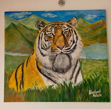 Title: Tiger – River and MountainsMedium: Oil on canvasDimensions: 107 cm x 94 cmArtist: Shashank Nakate